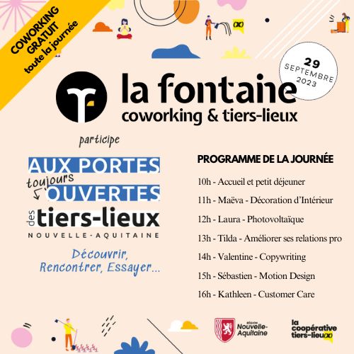 Le vendredi 29 septembre, c’est la 3ème édition des « Portes toujours ouvertes des tiers-lieux en Nouvelle-Aquitaine », organisé par La Coopérative Tiers-Lieux et la Région Nouvelle-Aquitaine !Ce jour-là, La Fontaine te propose non seulement de venir coworker sans payer (ça ne se refuse pas§) et aussi de découvrir le coworking via ses coworkers …