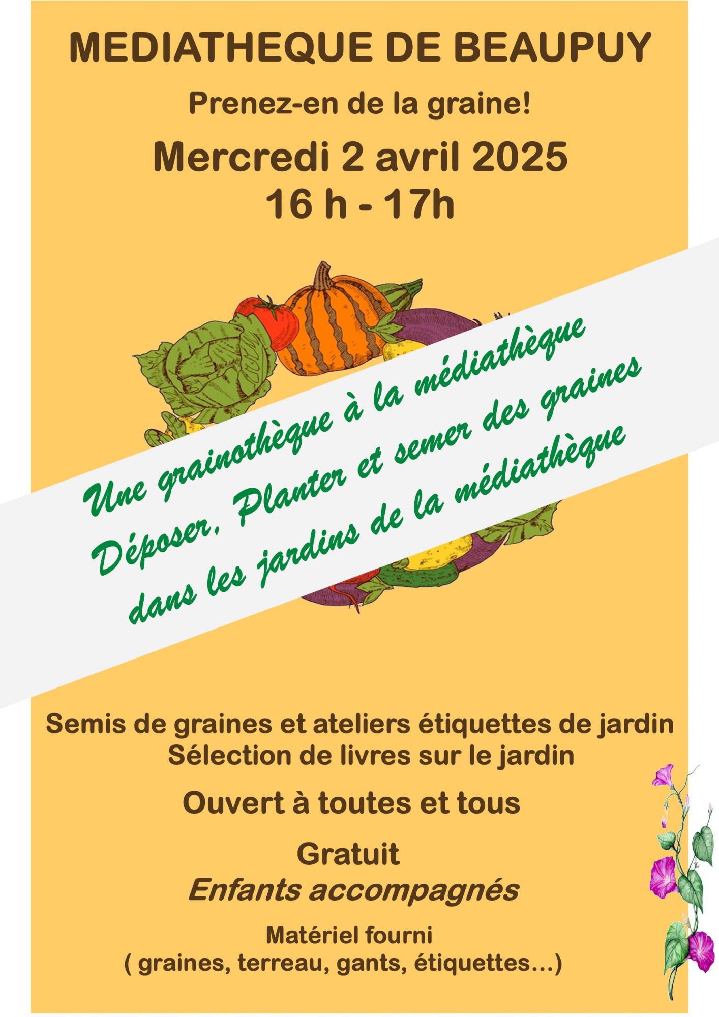 Nous avons le plaisir de vous inviter à un atelier intergénérationnel pour notre atelier grainothèque, qui aura lieu le Mercredi 2 avril 2025 de 16h à 17h au jardin de la médiathèque.