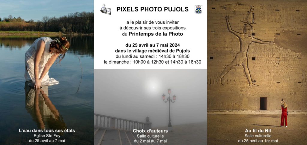 Trois expositions de l’association Pujols Pixels Photo au bourg de Pujols à partir du 25 avril dans le cadre du Printemps de la photo.