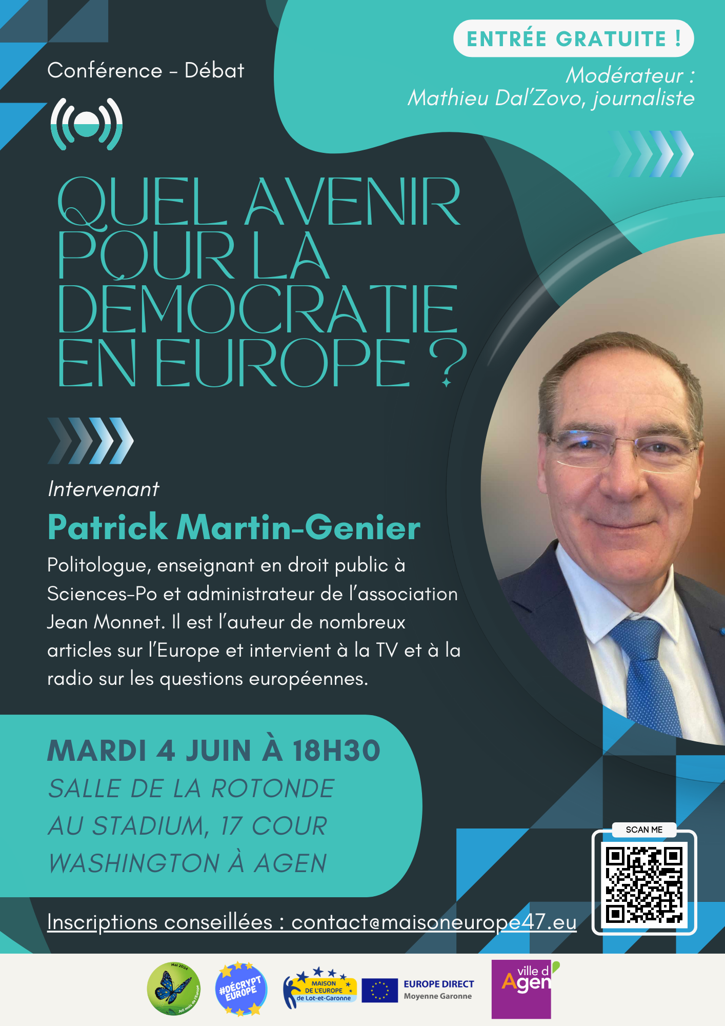 Cette conférence intitulée « Quel avenir pour la démocratie en Europe ? » sera présentée par Patrick Martin-Genier, politologue, enseignant en droit public à Sciences-Po et administrateur de l’association Jean Monnet. Il est aussi l’auteur de nombreux articles sur l’Europe et intervient à la TV et à la radio sr les questions européennes.