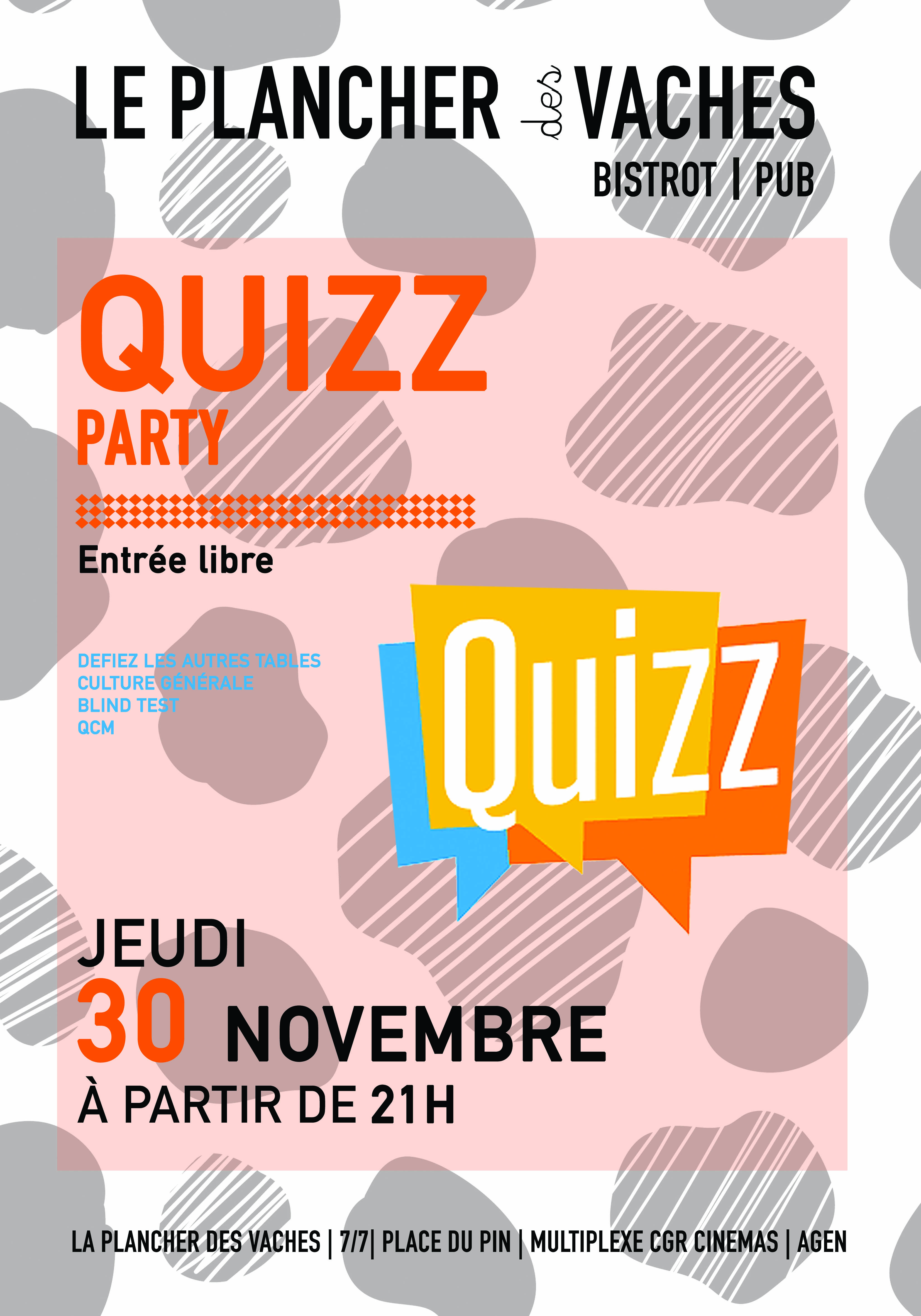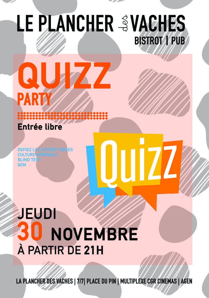 Le Plancher vous propose sa soirée Quizz.On affronte les autres tables pour être dans les 3 premiers et repartir avec des cadeaux.40 questions pour être les vainqueurs de la soirée.