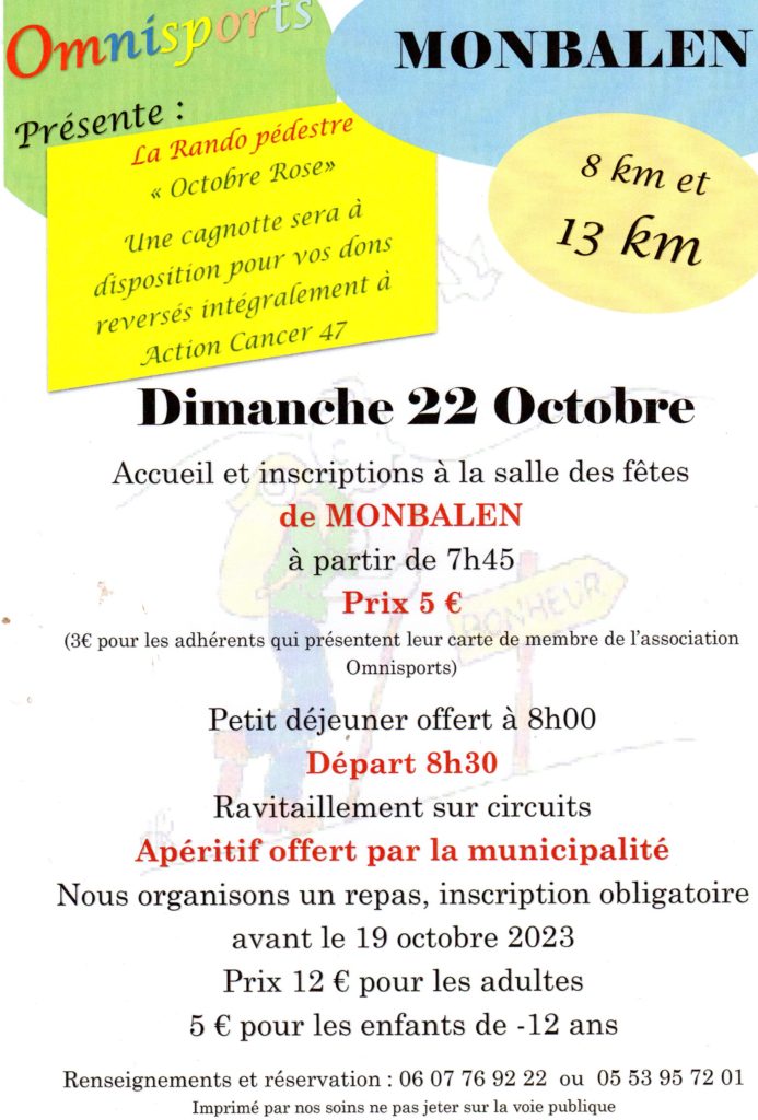 L’association Omnisports de Monbalen organise une randonnée pédestre Octobre Rose avec 2 parcours de 8 et 13 kms.