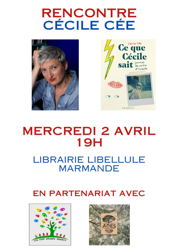 En partenariat avec l’association » Les Yeux grands ouverts » et le centre de formation de Marmande l’ADES, nous sommes ravis d’accueillir le mercredi 2 avril, l’auteure Cécile Cée.