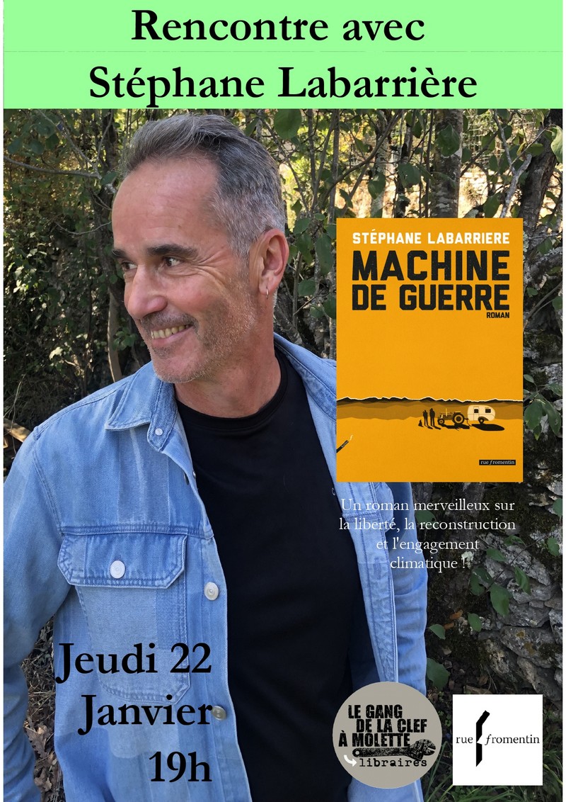 Jeudi 22 janvier à 19h, nous aurons le plaisir de recevoir l’écrivain Stéphane Labarrière pour une conversation autour de son merveilleux roman « Machine de guerre » paru aux Editions Rue Fromentin.