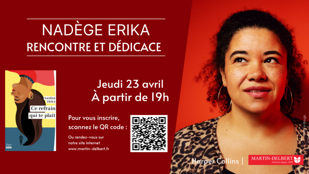 Nous sommes ravis de vous annoncer une rencontre en compagnie de Nadège Erika lors d’une soirée exceptionnelle le jeudi 23 avril 2026 de 19h à 21h suivie de la dédicace de son roman Ce refrain qui te plaît aux éditions Harper Collins.