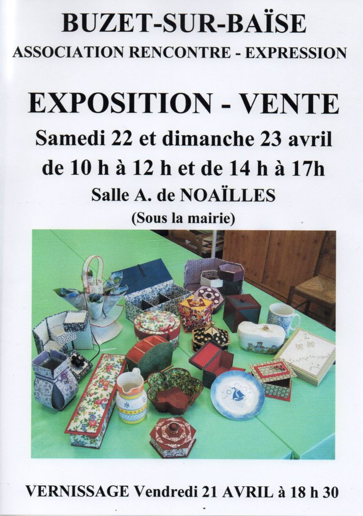L’association Rencontre Expression organise une exposition vente le samedi 22 et le dimanche 23 avril: peinture sur porcelaine, réalisations en cartonnage, travaux de couture.