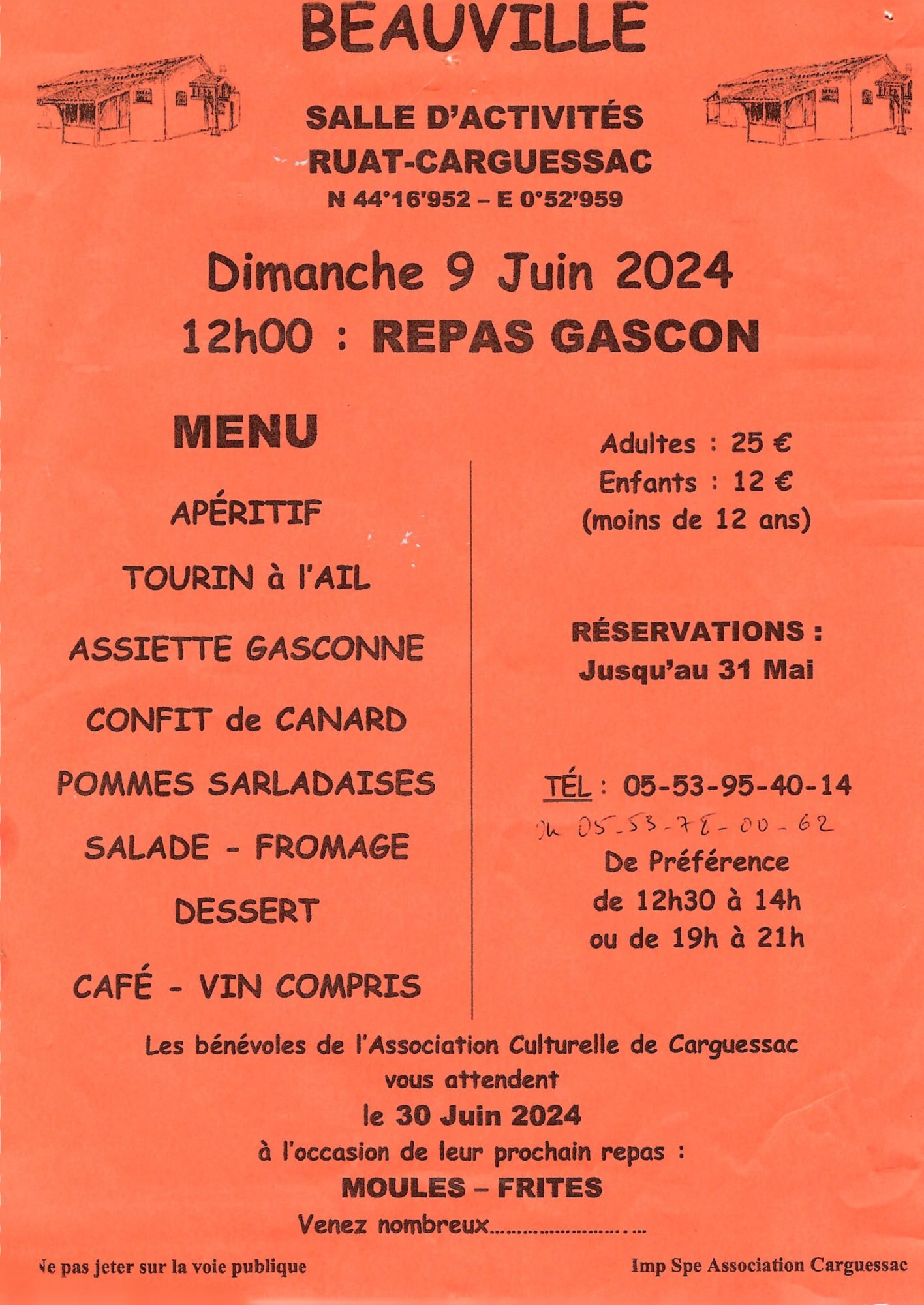 Loisirs REPAS GASCON Ruat Carguessac - Beauville 1383 Route de la Petite Séoune Beauville Voir tous les événements se déroulant ici le 9 juin 2024 12H Familial 25€ Repas champêtre ASSOCIATION CULTURELLE ET LAIQUE DE CARGUESSAC 05 53 95 40 14 carguessac@gmail.com
