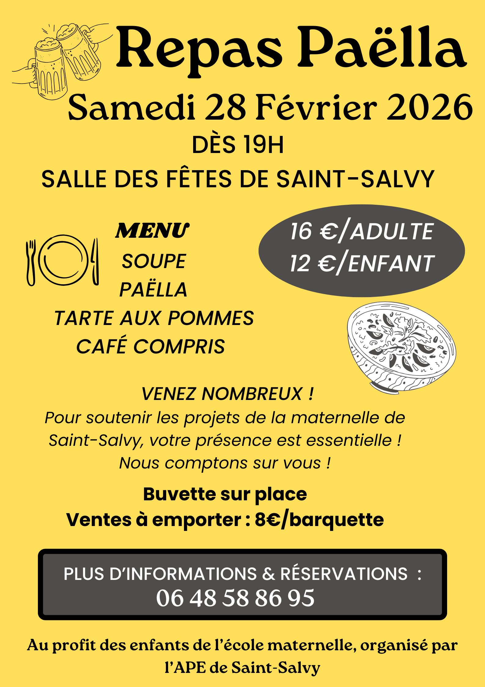 L’APE de l’école maternelle de Saint-Salvy organise un repas Paëlla le 28 Février 2026 à partir de 19h à la salle des fêtes de Saint-Salvy.