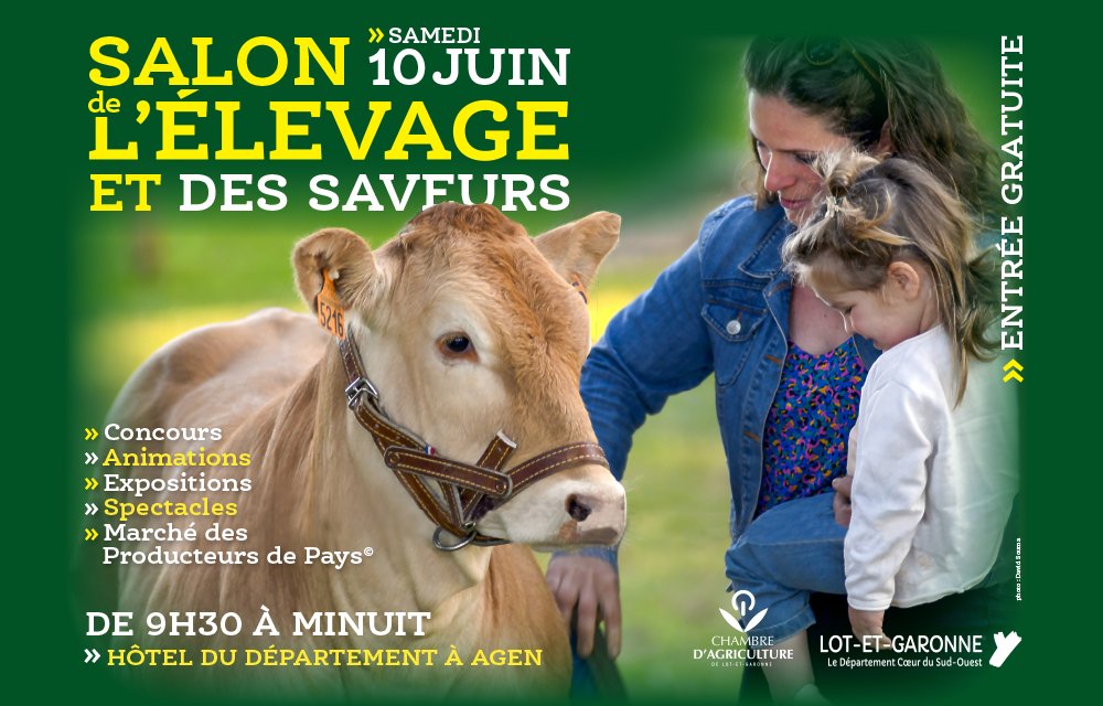 Co-organisé par le Conseil départemental et la Chambre d’agriculture de Lot-et-Garonne, le Salon de l’élevage et des saveurs se tiendra ce samedi 10 juin 2023, de 9h30 à minuit, à l’Hôtel du Département à Agen.