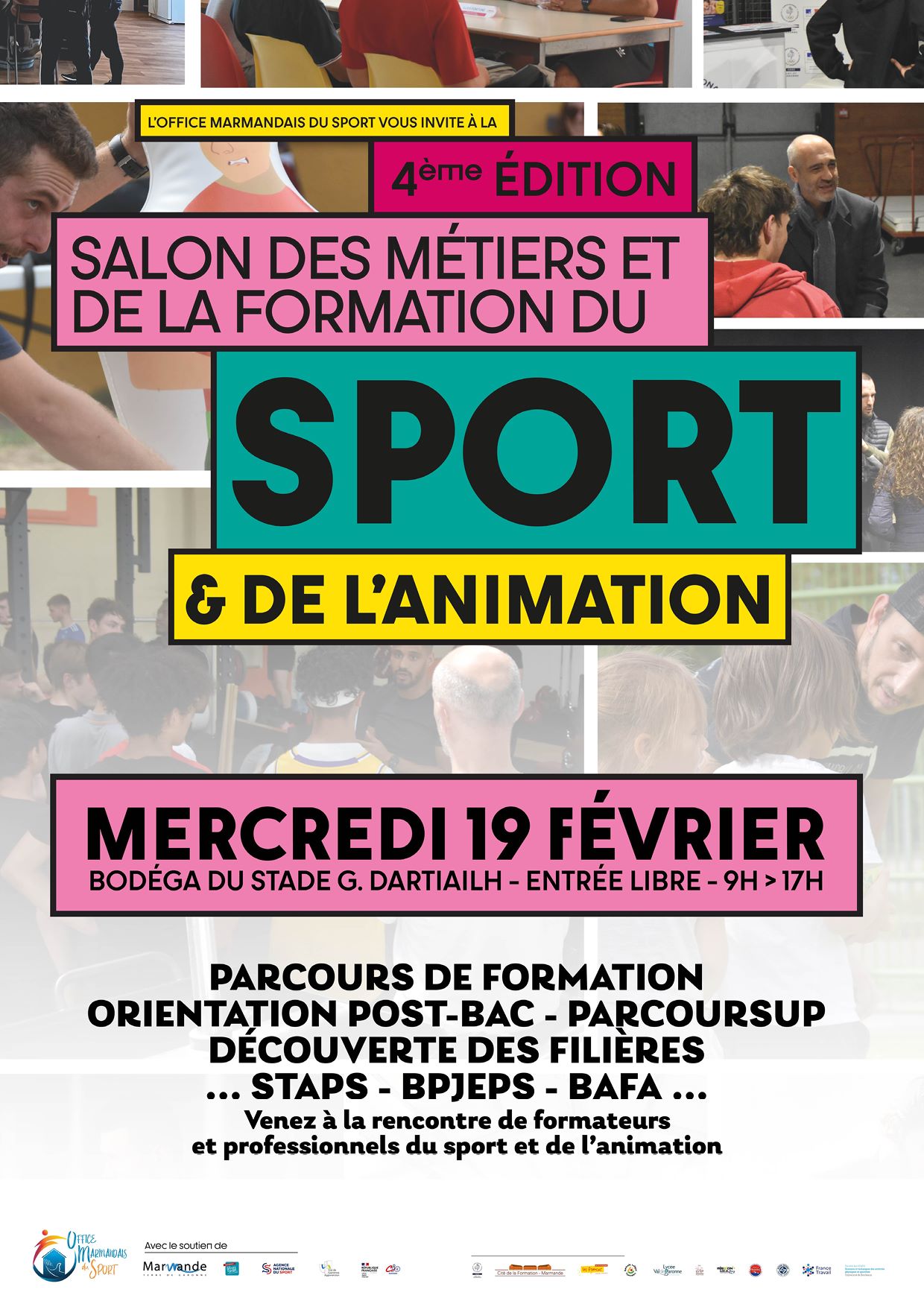 Le Salon des Métiers et de la Formation du Sport et de l’Animation revient pour une 4ᵉ édition à Marmande ! Cet événement, entièrement gratuit et ouvert à tous, est une occasion unique de découvrir les différentes formations accessibles sur le territoire, telles que STAPS, BPJEPS ou encore BAFA.