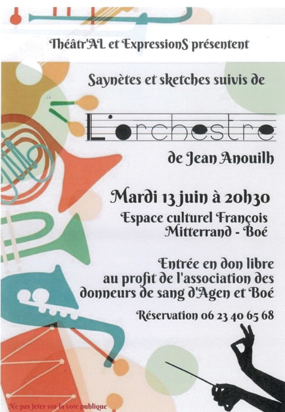 Théâtr’AL et ExpressionS présentent Saynètes et sketches suivis de L’Orchestre de Jean Anouilh le mardi 13 juin à 20h30, à l’Espace Culturel François Mitterrand.