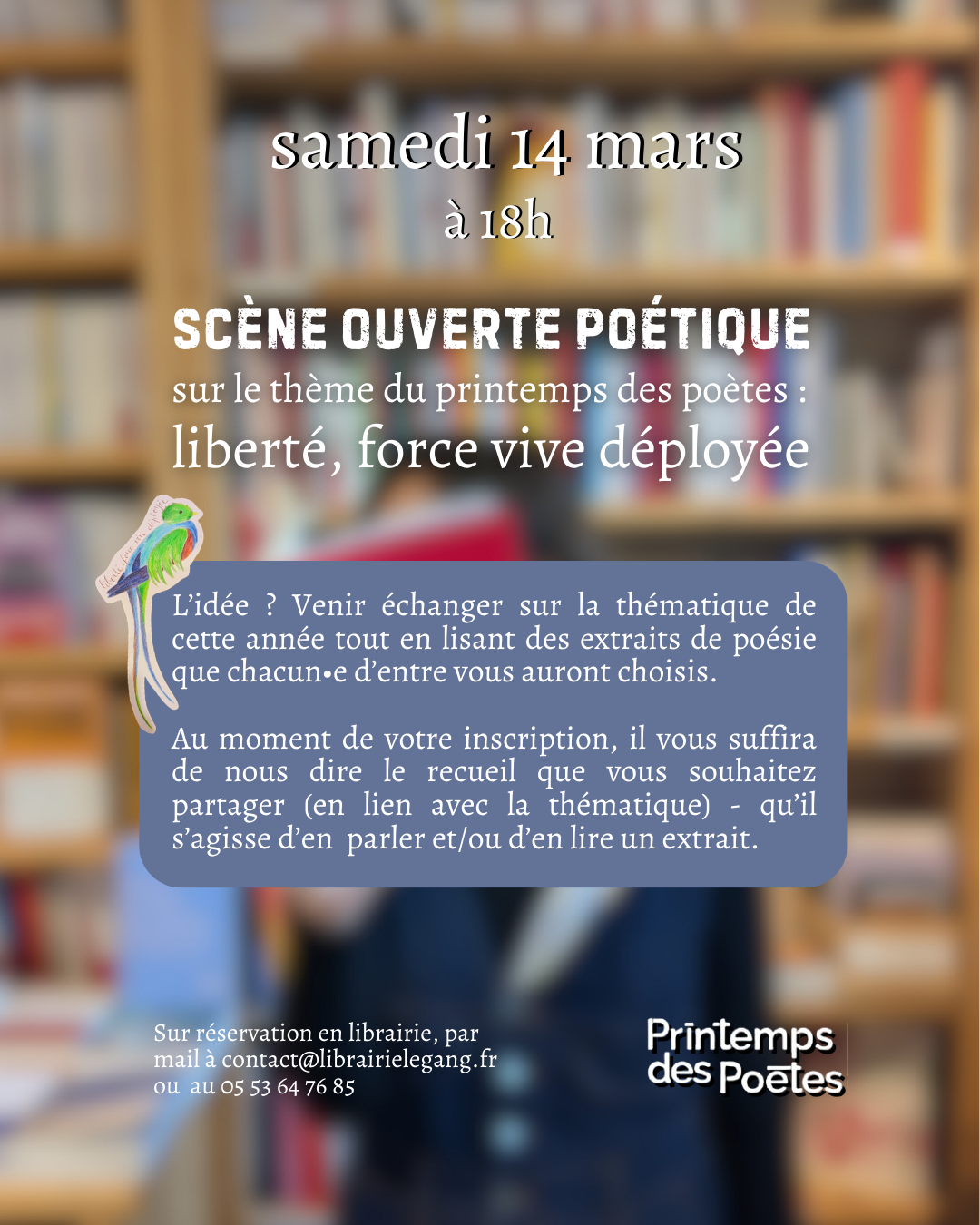 Ce samedi 14 mars à 18h, à l’occasion du Printemps des Poètes 2026, une scène ouverte vous est proposée à la librairie.