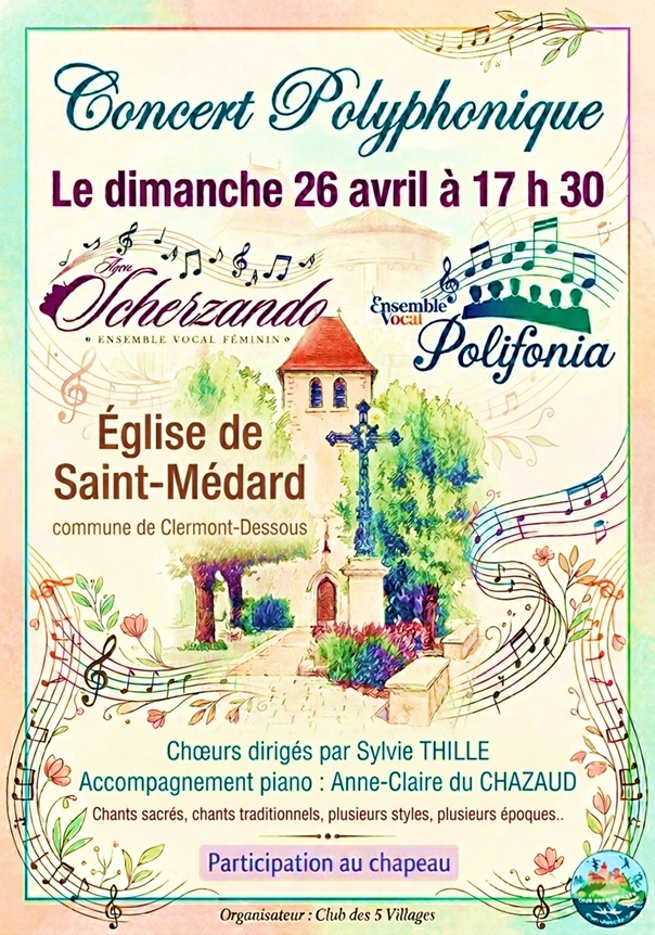 Concert donné par 2 ensembles vocaux de l’agenais, Scherzando (chœur féminin) et Polifonia (chœur mixte), qui interprèteront dans une jolie petite église avec une belle acoustique, un répertoire varié (chants sacrés, traditionnels, …) sous la direction de Sylvie Thille, Anne-Claire du Chazaud les accompagnera au piano.