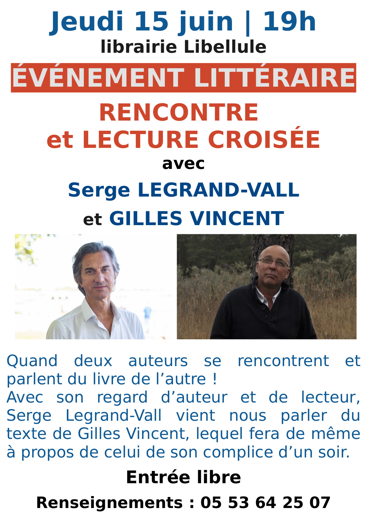Une formidable soirée littéraire s’annonce ! Pour vous, deux auteurs viennent ensemble parler, lire et commenter le livre de l’autre.Un grand moment d’échange en perspective sur la littérature et le regard que lui portent les écrivains… qui sont aussi des lecteurs ! Nous aurons donc le très grand plaisir de recevoir Serge Legrand-Vall pour « Un oubli sans nom » et Gilles Vincent pour « Dans la douleur du siècle » qui vont se prêter à ce jeu de lecture croisée