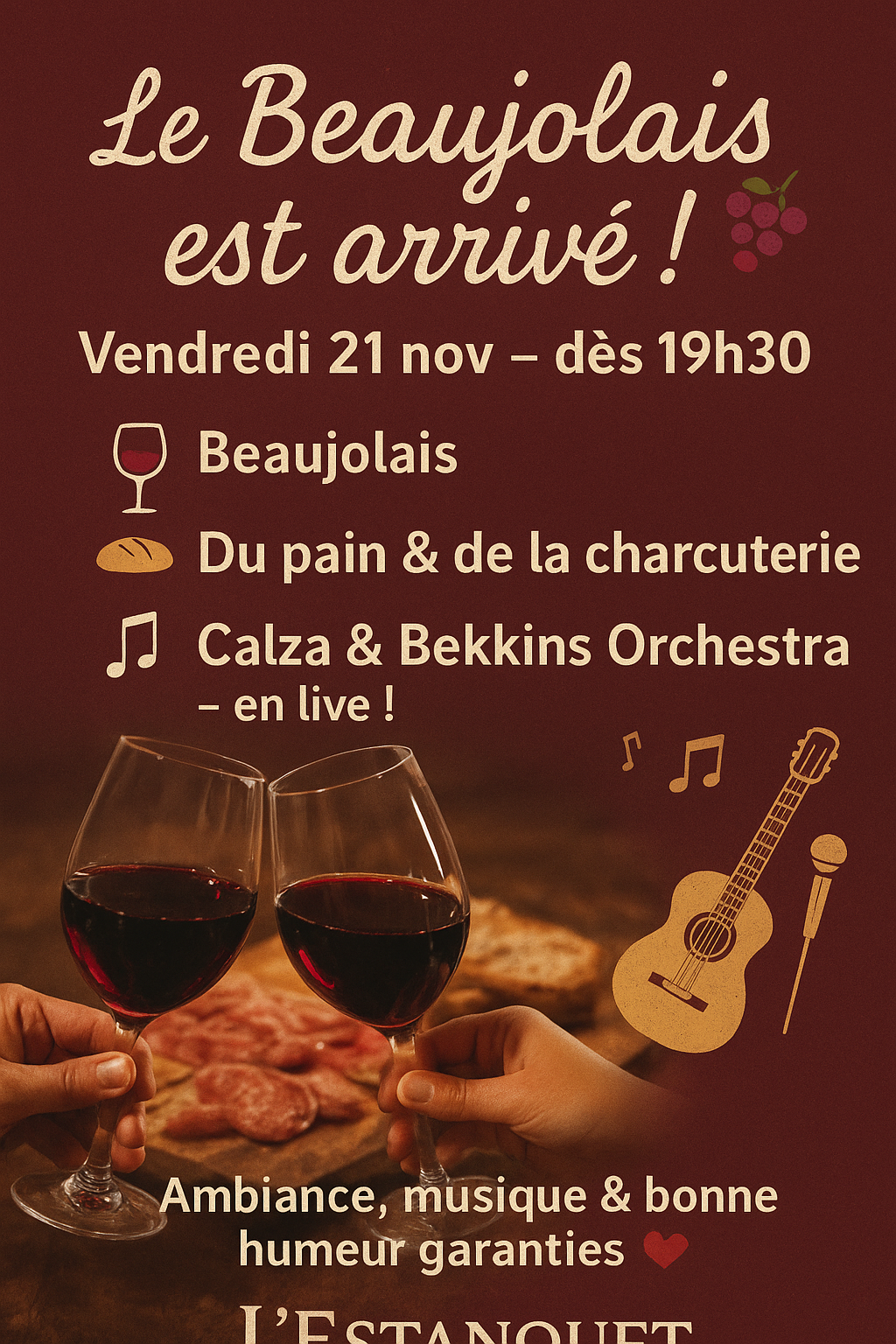 Viens célébrer cette soirée conviviale autour de Beaujolais, pain, et charcuterie.