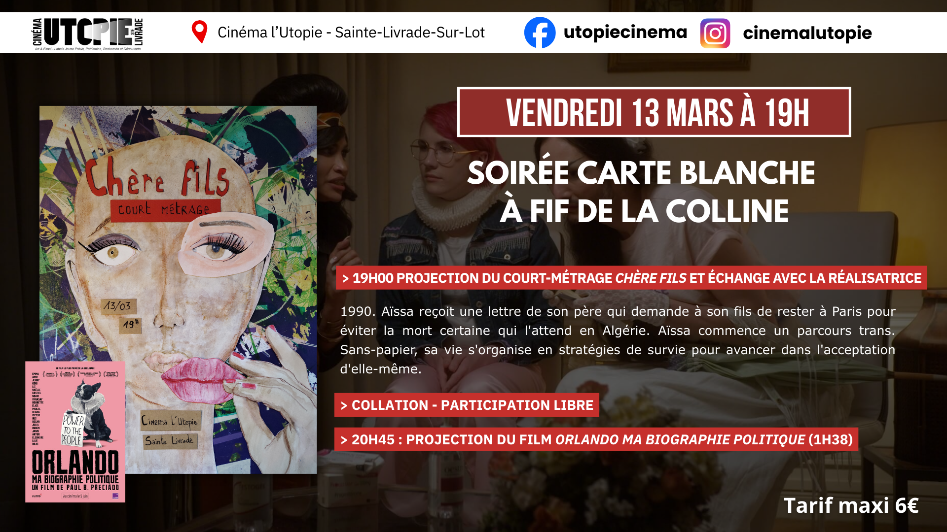 Collation offerte (participation libre) avant la projection du film choisi par Fif de la Colline : Orlando, ma biographie politique.