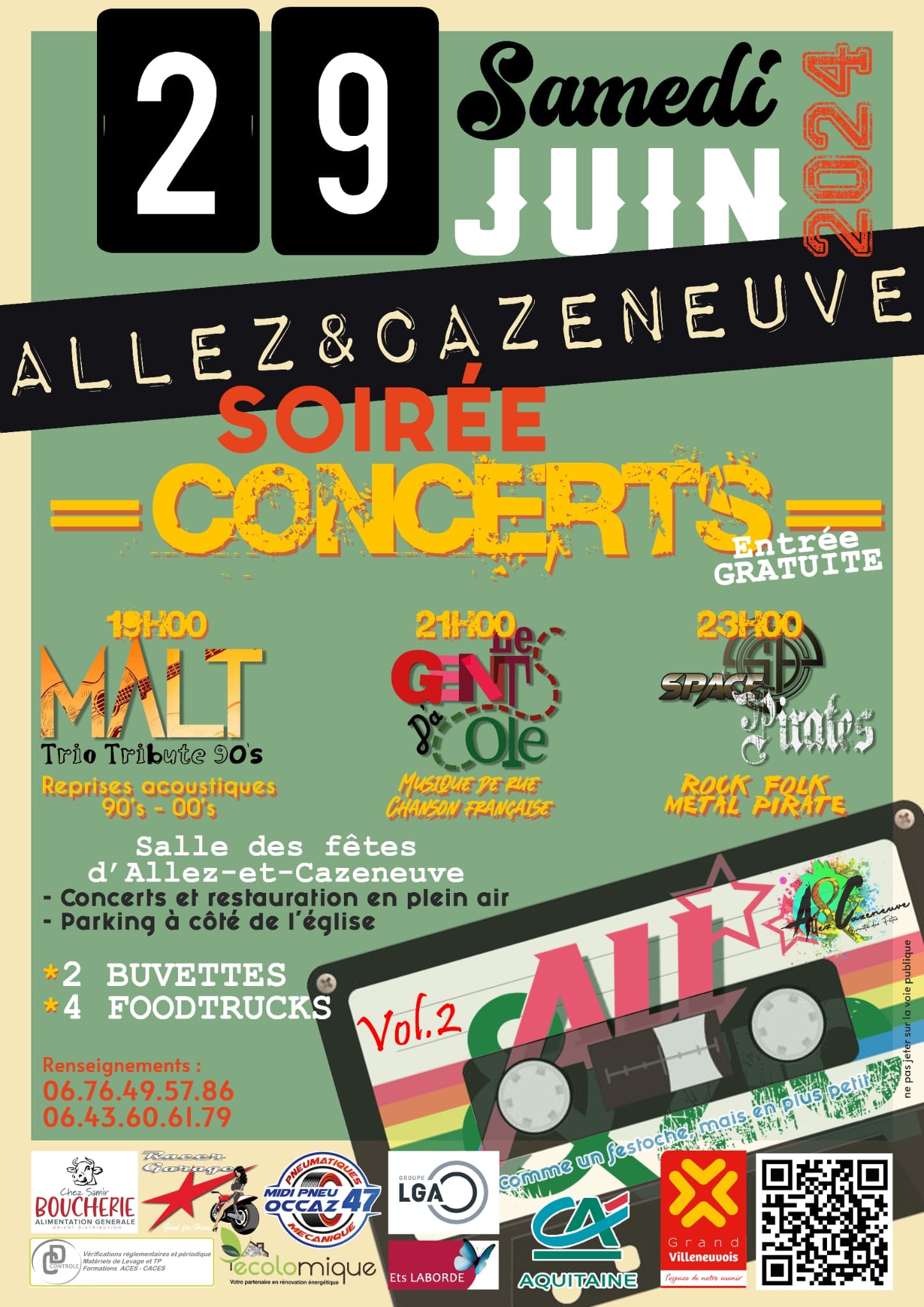 Événement organisé par le Comité des Fêtes d’Allez-et-Cazeneuve.Venez vous ambiancer le 29 juin devant la salle des fêtes d’Allez-et-Cazeneuve. On vous propose un petit festival !Les groupes au programme :A 19h Malt Trio Tribute 90’s (reprises acoustiques 90’s-00’s)