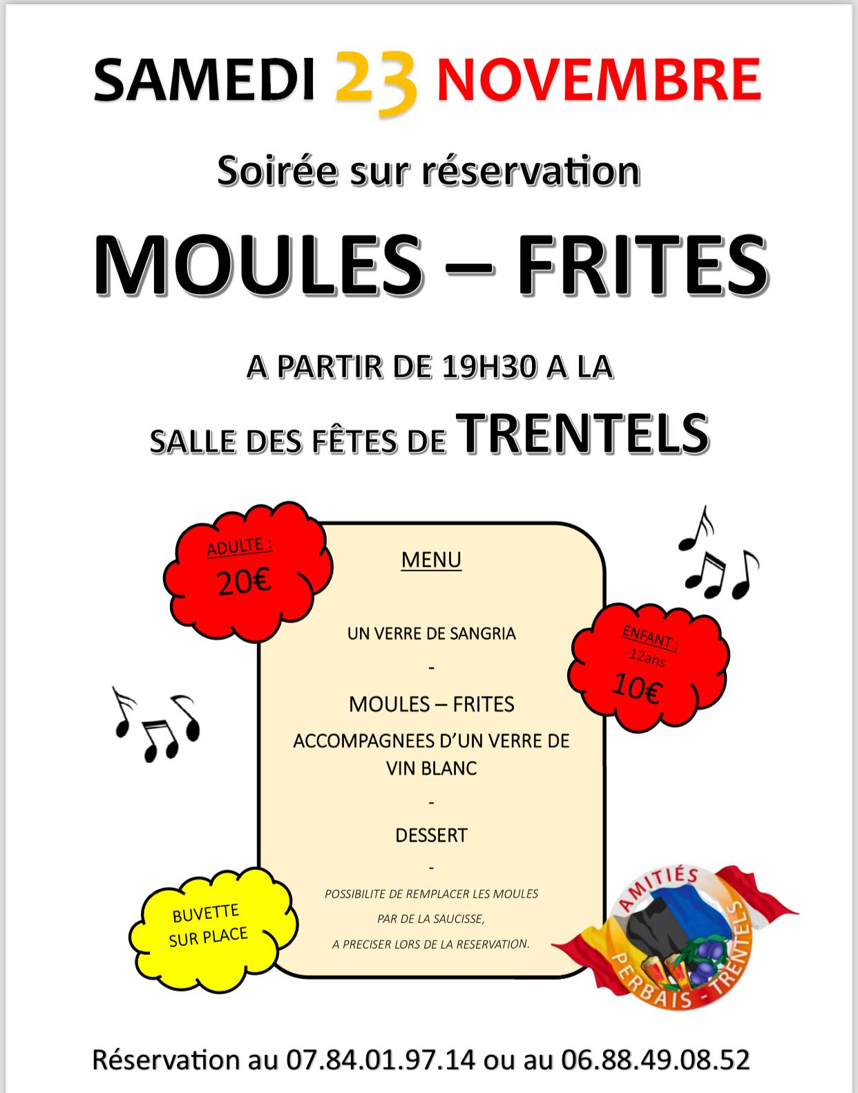 Soirée Moules Frites sur réservation (possible de remplacer les moules par de la saucisse, à préciser lors de la réservation).