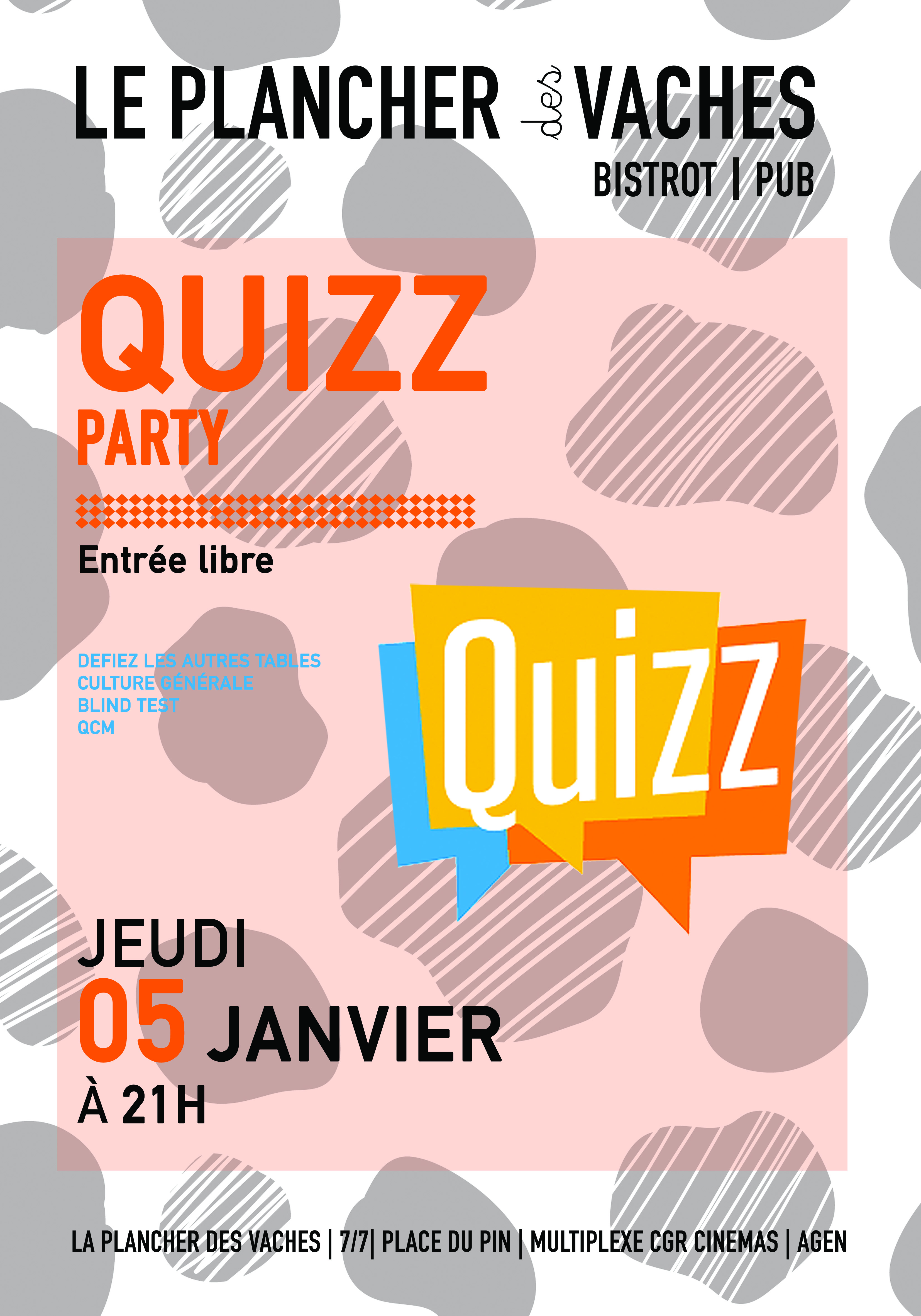Le Plancher vous propose sa soirée Quizz.On affronte les autres tables pour être dans les 3 premiers et repartir avec des cadeaux.40 questions pour être les vainqueurs de la soirée.