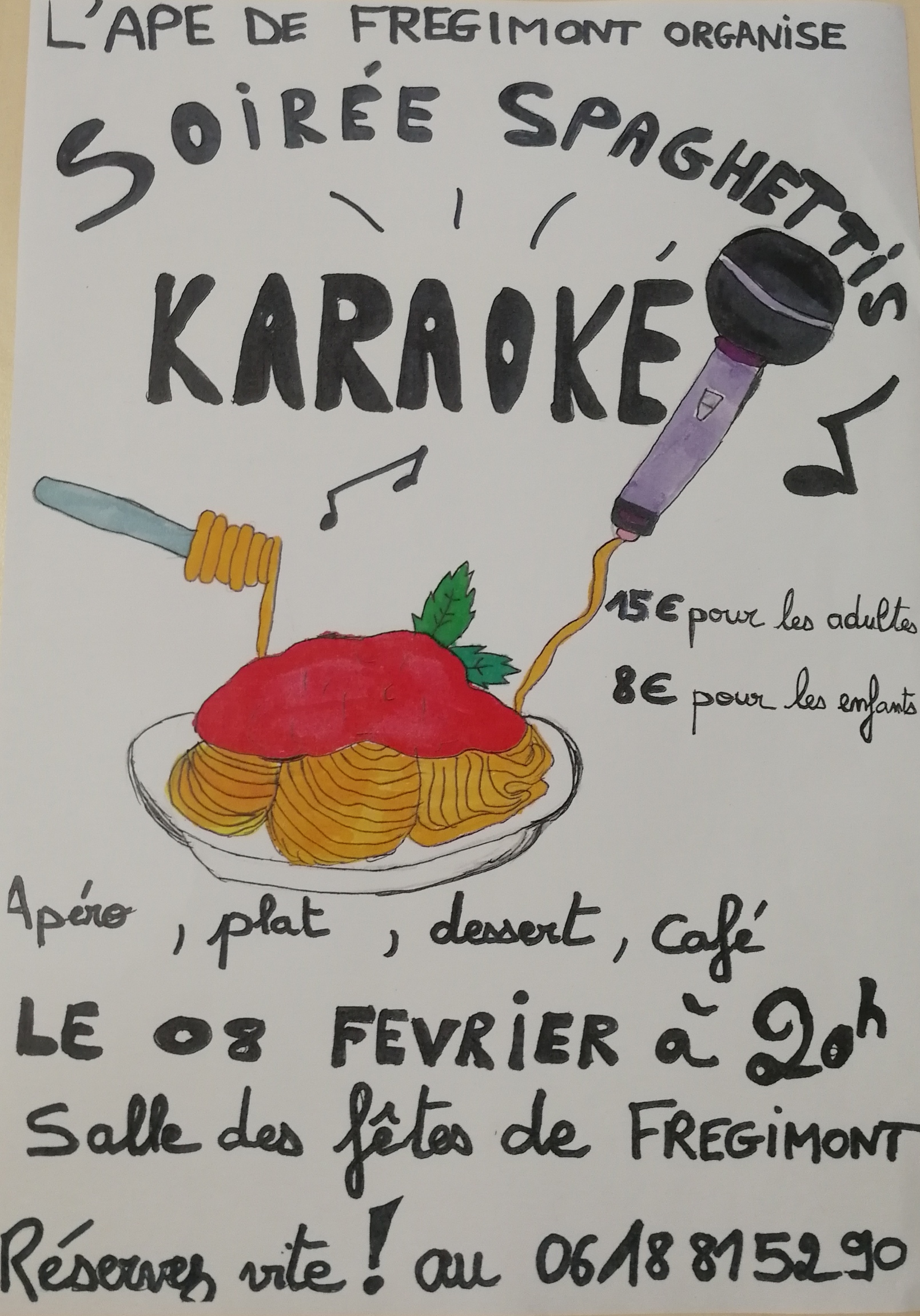 L’APE de Frégimont organise une soirée Spaghettis et Karaoké à 20h à la salle des fêtes de Frégimont.
