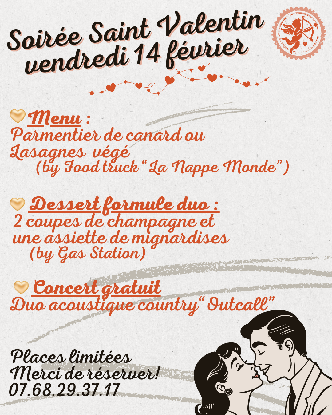 Soirée spécial St Valentin avec concert acoustique du duo country « The Outcall ».