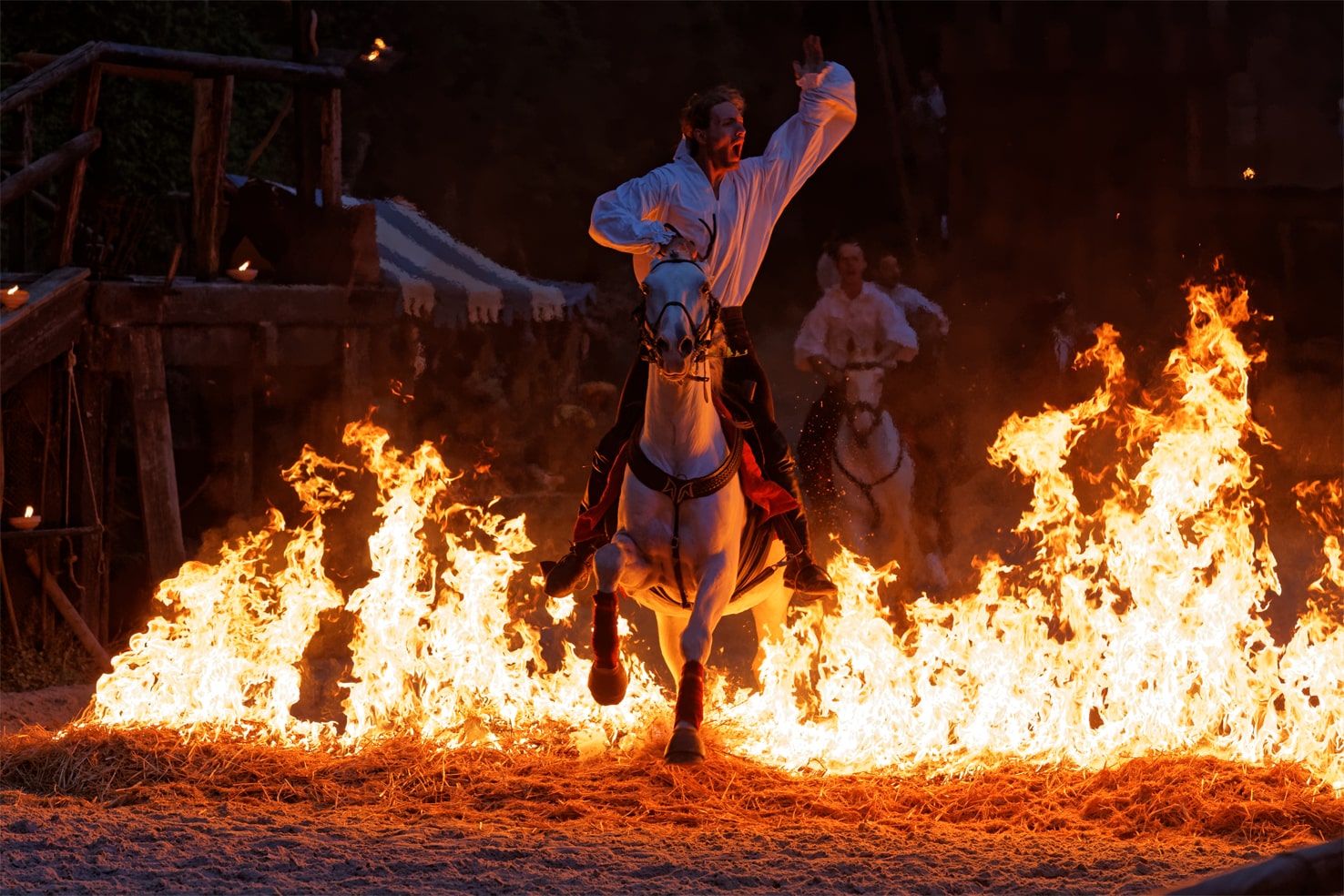 Un mariage étonnant entre le cheval, son cavalier et le feu au pied du Château.