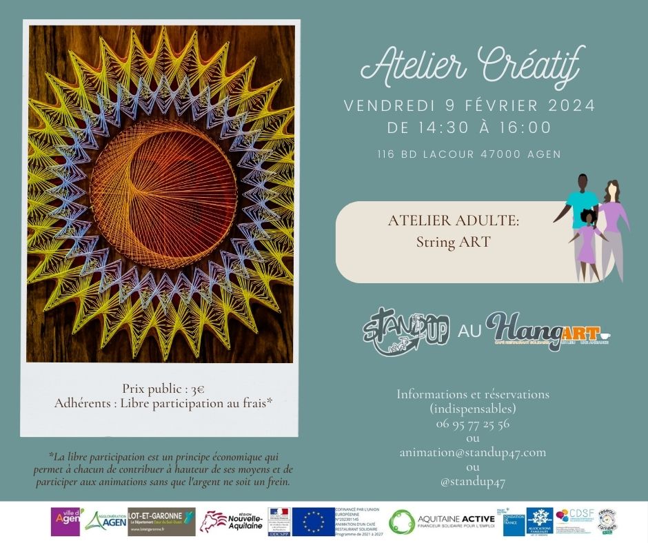 Loisirs String Art Atelier Loisirs Créatifs Le Hang'art - Agen 116 Boulevard Edouard Lacour Agen Voir tous les événements se déroulant ici le 9 février 2024 De 14h30 à 16h 3€ Réalisation de String Art. Stand'UP 06 95 77 25 56 animation@standup47.com