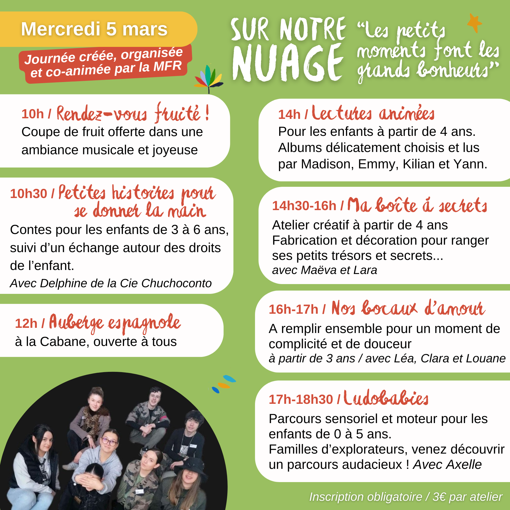 10h30: Petites histoires pour se donner la main. Contes pour les enfants de 3 a 6 ans, suivi d’un échange autour des droits de l’enfant.