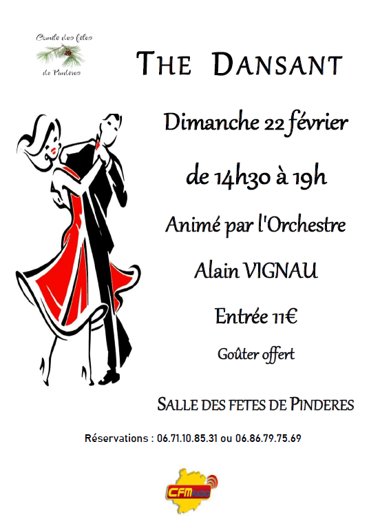 Venez danser à Pindères, le dimanche 22 février 2026, à partir de 14h30. Le thé dansant sera animé par l’orchestre Alain Vignau, à la salle des fêtes de Pindères, route de Lartigue.