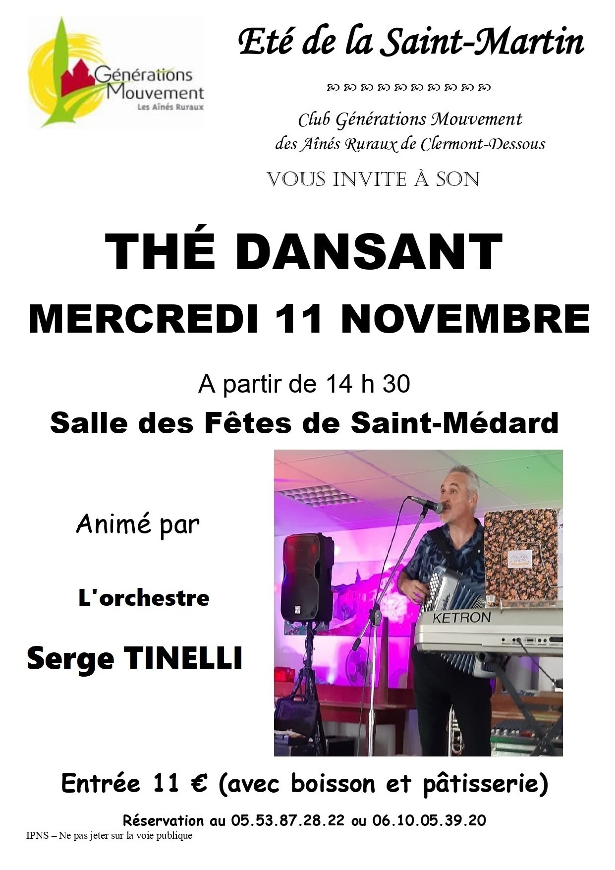 Nous vous donnons rdv avec Serge Tinelli à notre prochain thé dansant, mercredi 11 novembre à 14h30 à la salle des fêtes à Saint-Médard pour passer un après-midi sous le signe de la musique, de la danse, des gourmandises et surtout … de la convivialité !