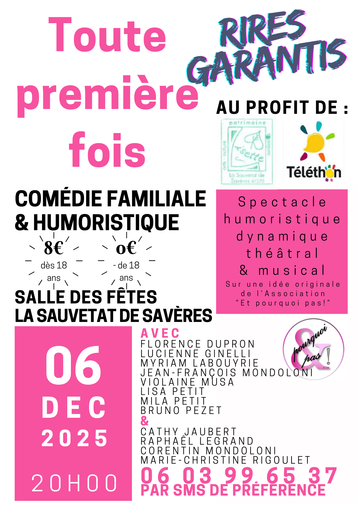 Pour la première fois, l’association « Et pourquoi pas ! » va vous présenter à La Sauvetat-de-Savères son premier spectacle et ainsi, pour la première fois, les comédiens vont se retrouver sur la scène de la Salle des fêtes tous ensemble et certains, pour la première fois.