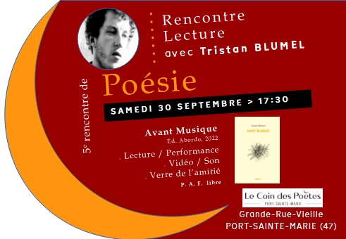 Le Coin des Poètes reçoit Tristan Blumel pour un voyage en Toésie…Né en 1989, Tristan Blumel vit et travaille à Nice.Engagé dans la création qui va du jeu sur papier à la performance orale, il œuvre sans cesse pour que la poésie ait une plus large présence dans l’espace contemporain. Il est membre du collectif artistique niçois PALAM, dont le nœud créatif est la randonnée en nature et les questions écologiques actuelles, et du collectif de Poésie actuelle « La dernière Vague ».