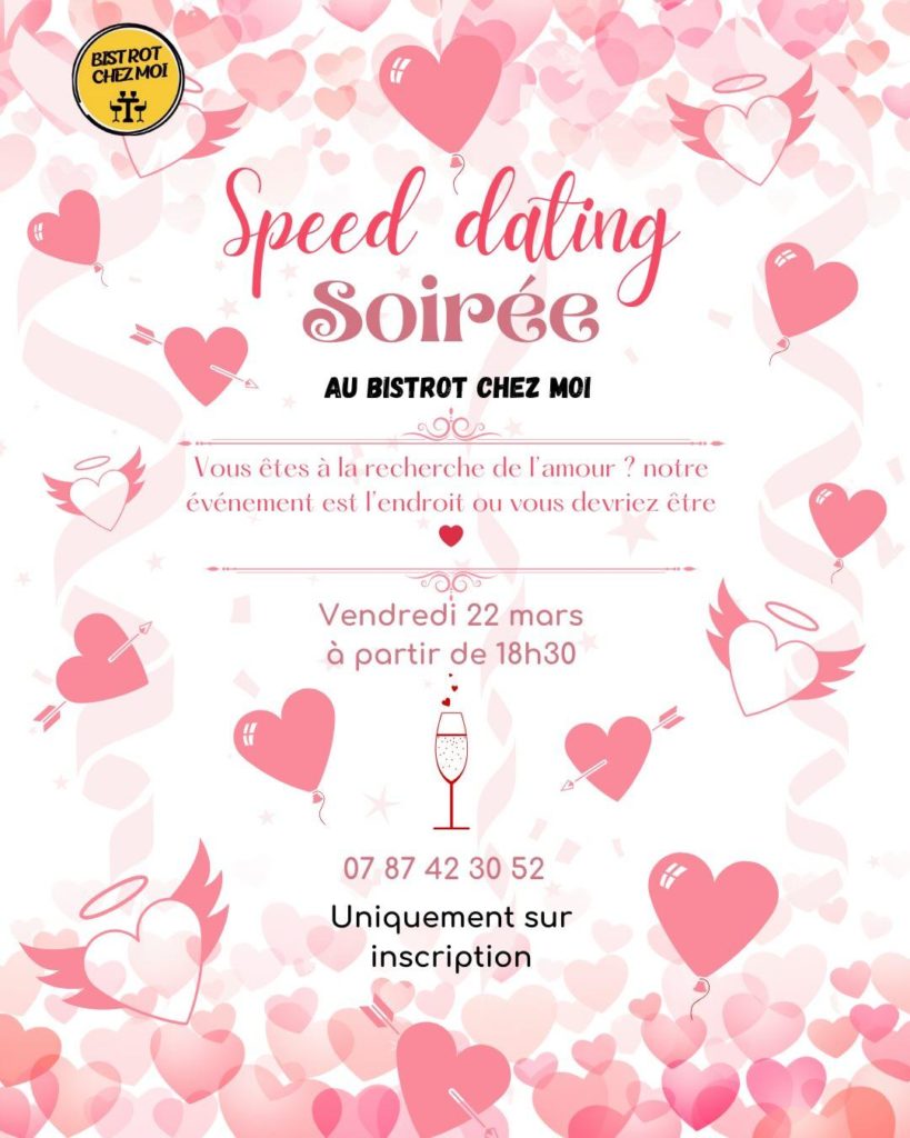 Cher(e) célibataire en quête de l’amour, Êtes-vous prêt(e) à changer le cours de votre vie en une seule soirée ? Imaginez-vous dans une ambiance envoûtante, entouré(e) de personnes vibrantes d’énergie et d’excitation, toutes à la recherche de cette connexion spéciale. Bienvenue à notre soirée de speed dating, une expérience qui peut transformer votre destinée amoureuse. Oubliez les rencontres ennuyeuses en ligne et les soirées sans saveur. Nous vous offrons une occasion unique de rencontrer en personne des célibataires aussi déterminés que vous à trouver leur âme sœur. Dans un cadre chaleureux et convivial, vous aurez l’opportunité de faire connaissance avec plusieurs personnes intéressantes, dans des rencontres éclair où chaque instant compte. Imaginez-vous échanger des regards complices, des sourires prometteurs, et des conversations qui font battre votre cœur plus vite. Chaque rencontre est une opportunité de découvrir une nouvelle facette de vous-même et de l’autre, dans une atmosphère légère et sans pression. Laissez-vous surprendre par la magie des premières impressions, car qui sait, votre coup de foudre pourrait être juste à côté de vous.Mais notre soirée de speed dating est bien plus qu’une simple rencontre. C’est une expérience enrichissante où vous pourrez élargir votre cercle social, tisser de nouvelles amitiés et peut-être même trouver l’amour véritable. Peu importe votre parcours, votre âge ou vos aspirations, cette soirée est ouverte à tous ceux qui croient en la magie de l’amour. Ne laissez pas cette chance unique passer à côté de vous. Inscrivez-vous dès maintenant et préparez-vous à vivre une soirée inoubliable où chaque moment peut changer le cours de votre vie. Rejoignez-nous et laissez la magie opérer. À très bientôt, pour une soirée qui pourrait bien être le début de votre plus belle histoire.