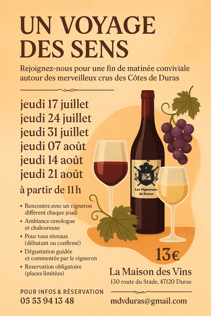 Une animation dégustation, tous les jeudis à partir de 11h du 17 juillet au 21 aout, qui sera commentée et guidée par un vigneron indépendant différent chaque jeudi des Côtes de Duras.