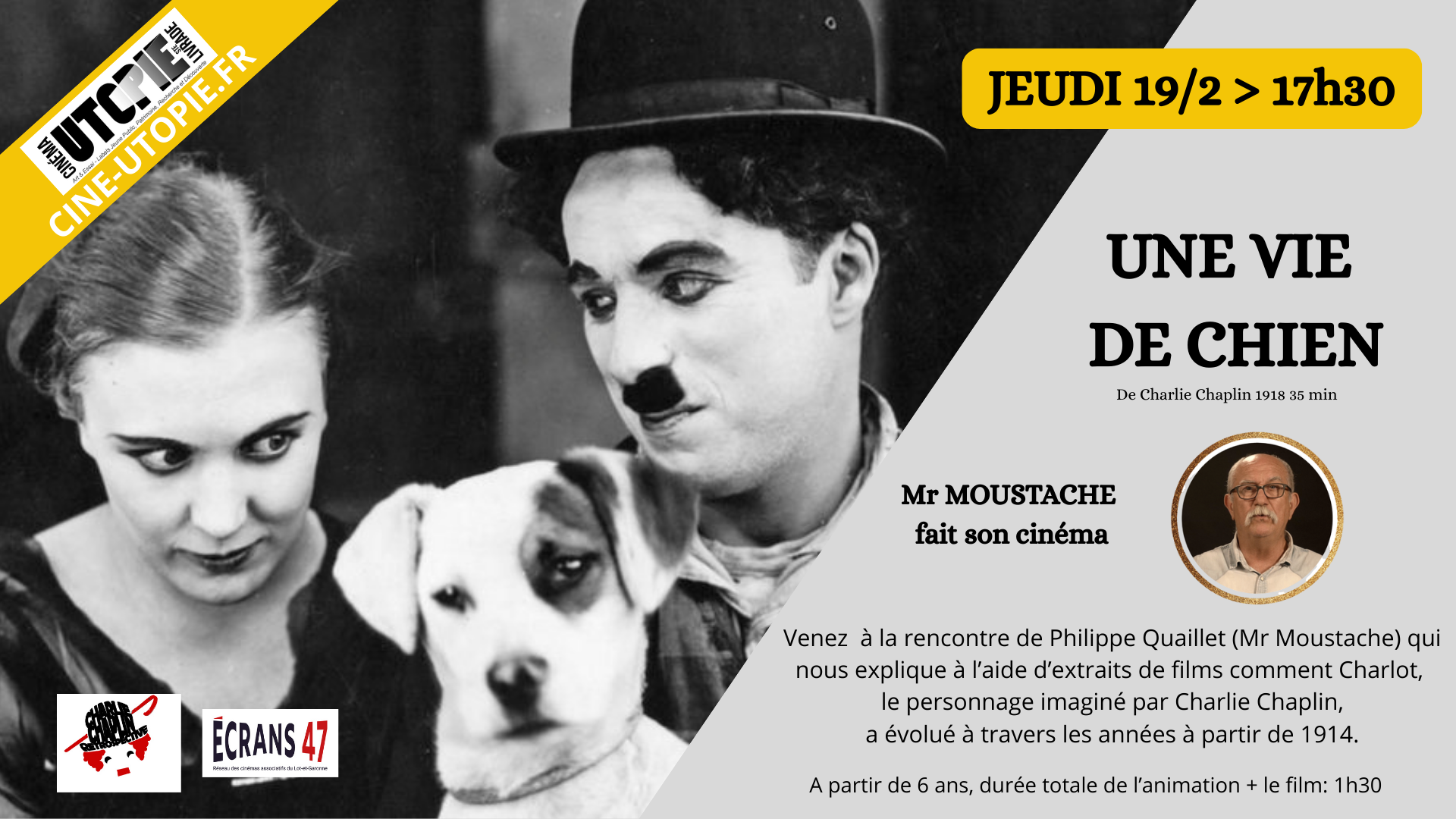 Projection suivie d’une analyse de l’évolution du personnage de Charlot par Philippe Quaillet, animateur, grâce à de nombreux extraits.