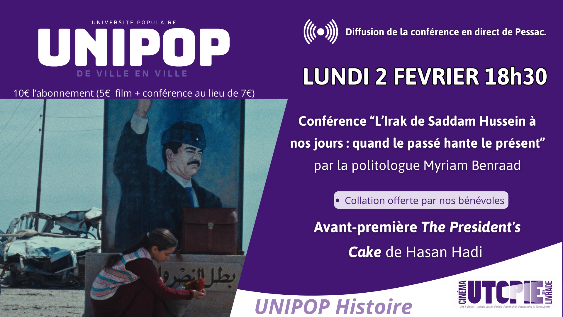 18h30 : Conférence « L’Irak de Saddam Hussein à nos jours : quand le passé hante le présent » par la politologue Myriam Benraad.
