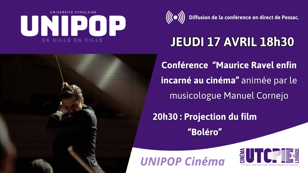 18h30 Conférence (en direct de Pessac) : « Maurice Ravel, enfin incarné au cinéma » par Manuel Cornejo (chercheur et président des Amis de Maurice Ravel).