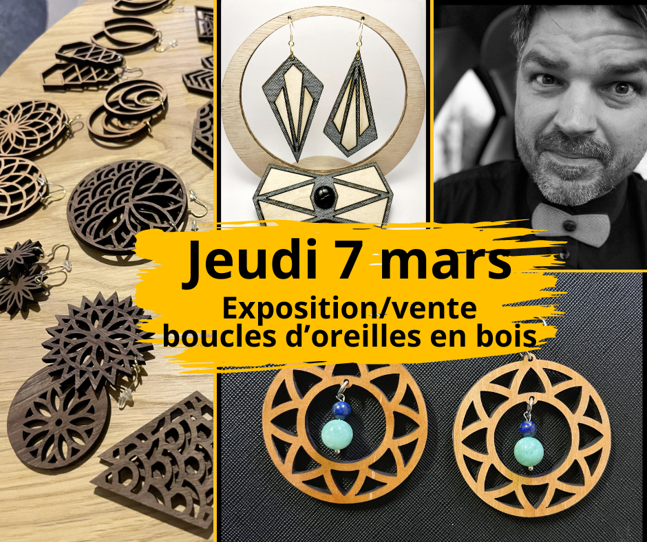Vincent Hogedez est créateur de boucles d’oreilles et de noeuds papillons en bois.Il sera à La Fontaine le jeudi 7 mars de 12h à 14h pour présenter ses créations (qui sont de toute beauté !).Comptez entre 25€ et 35€ pour avoir la chance d’acquérir un de ses modèles.Ouvert à tous.