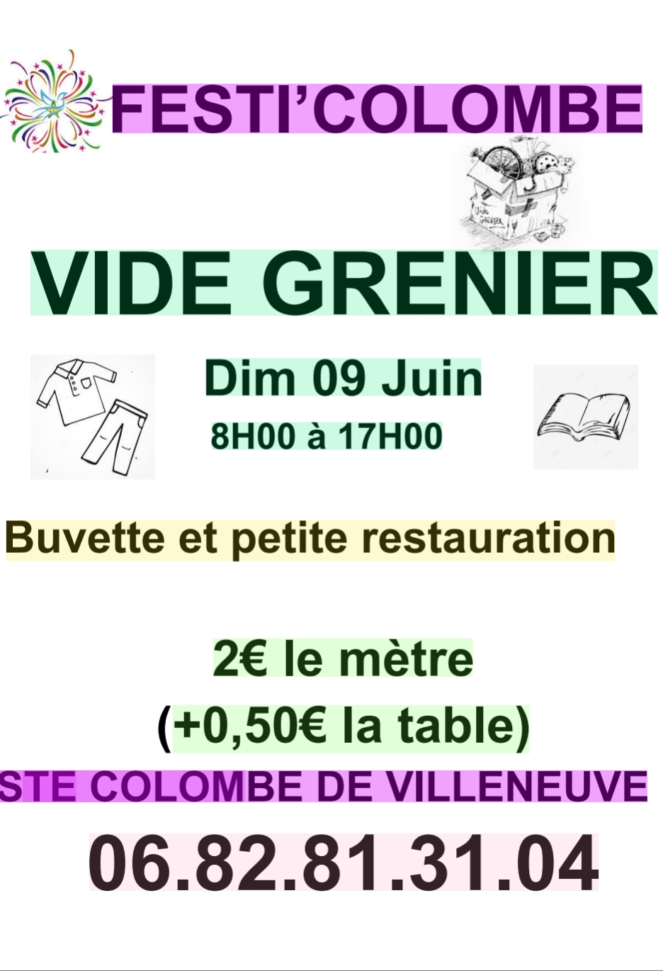 Loisirs VIDE-GRENIERS Bonnes trouvailles Sainte-Colombe-de-Villeneuve - Pujols Place de la Mairie Pujols Voir tous les événements se déroulant ici le 9 juin 2024 De 9h à 17h Gratuit Festi' Colombe 06 82 81 31 04 celine.mathau47@gmail.com