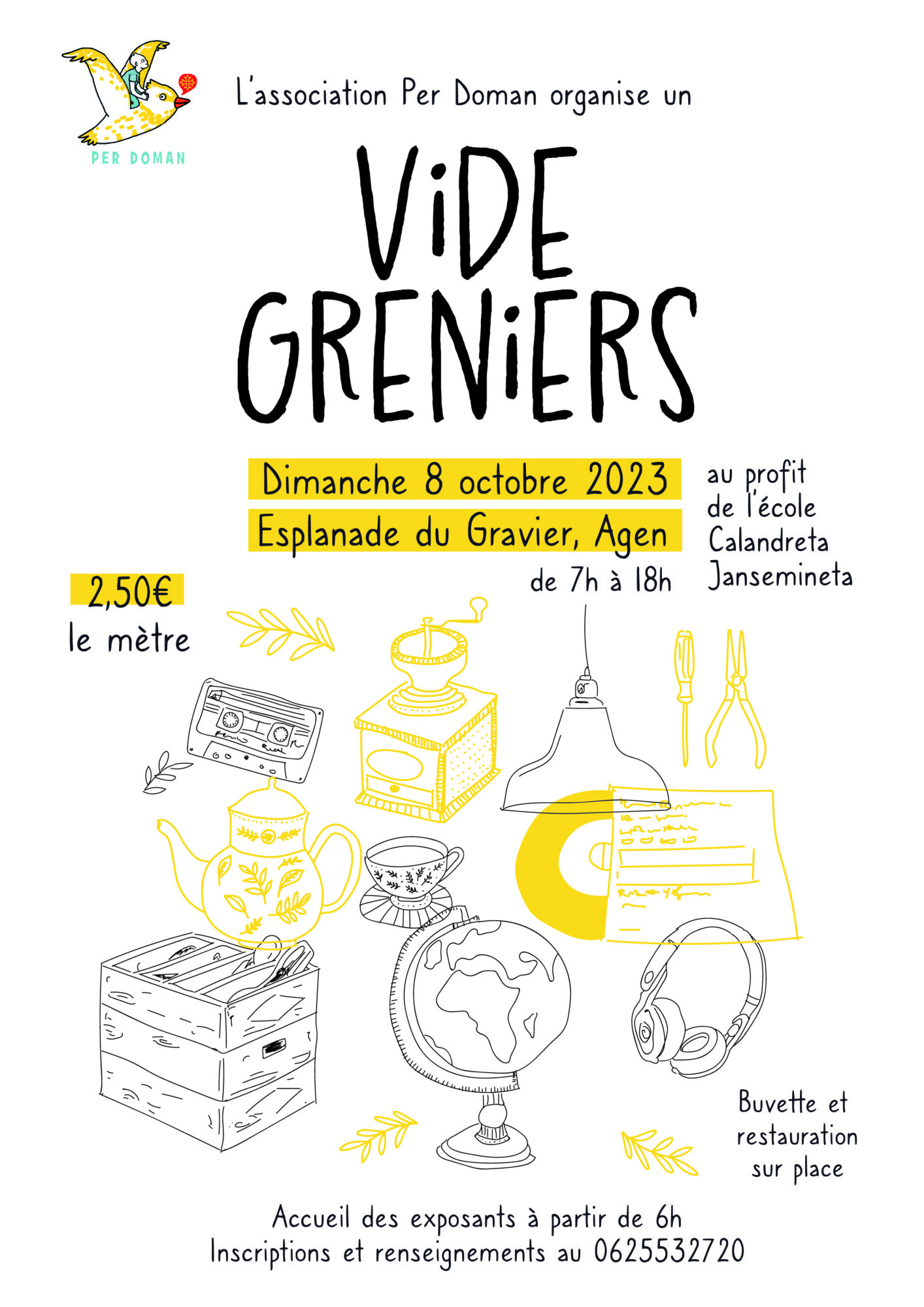 L’association Per Doman organise un vide-greniers au profit de l’école Calandreta Jansemineta d’Agen le Samedi 28 Juin 2025 de 8h à 18h au Galion à Foulayronnes (site de Flottis).