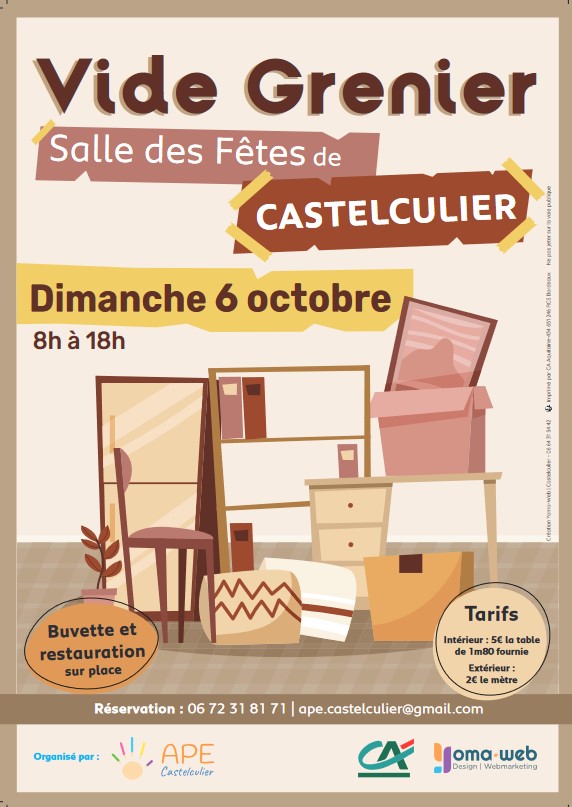 L’APE vous donne rendez-vous à la salle des fêtes de Castelculier le Dimanche 6 Octobre pour son Vide-greniers d’Automne.