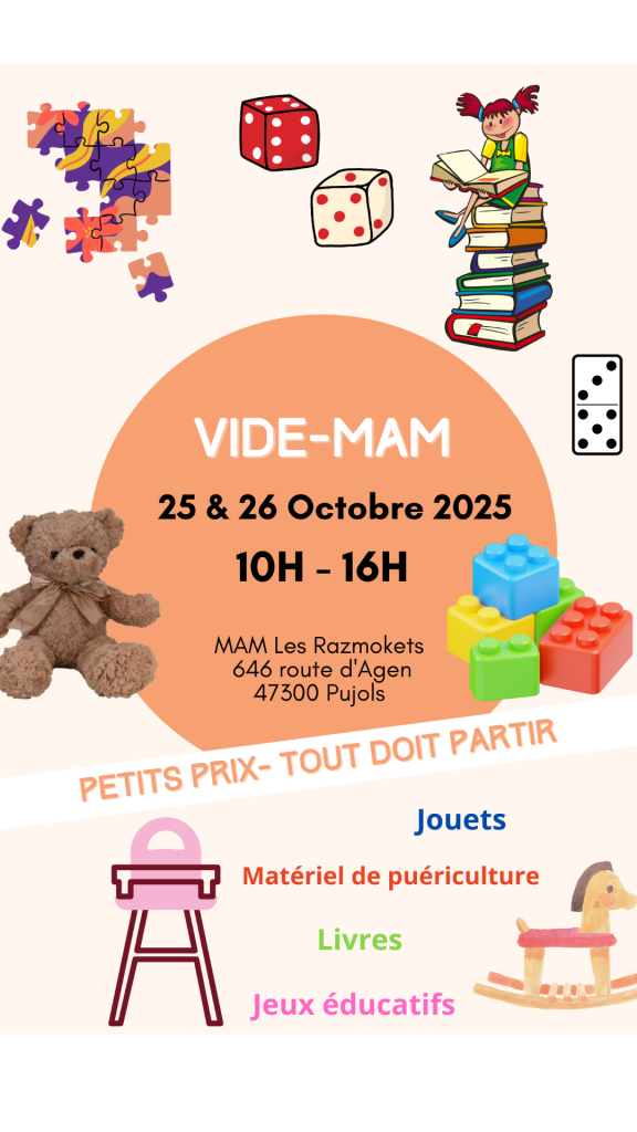 L’association Les Razmokets (Maison d’Assistantes Maternelles) vous invite à son grand Vide-MAM les samedi 25 et dimanche 26 octobre 2025.