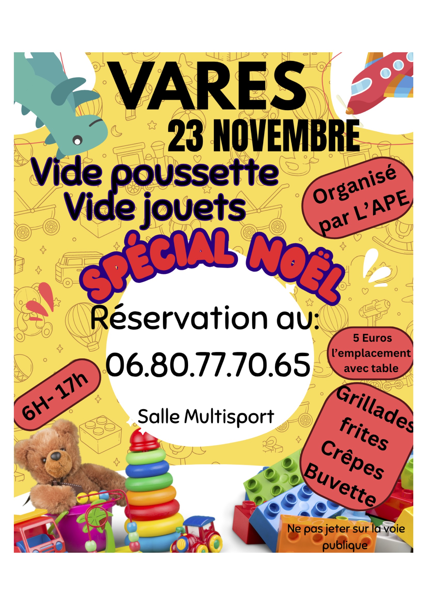 L’APE de Varès organise le dimanche 23 novembre un vide poussette et vide jouets spécial Noël en intérieur à la salle Multisport de Varès.