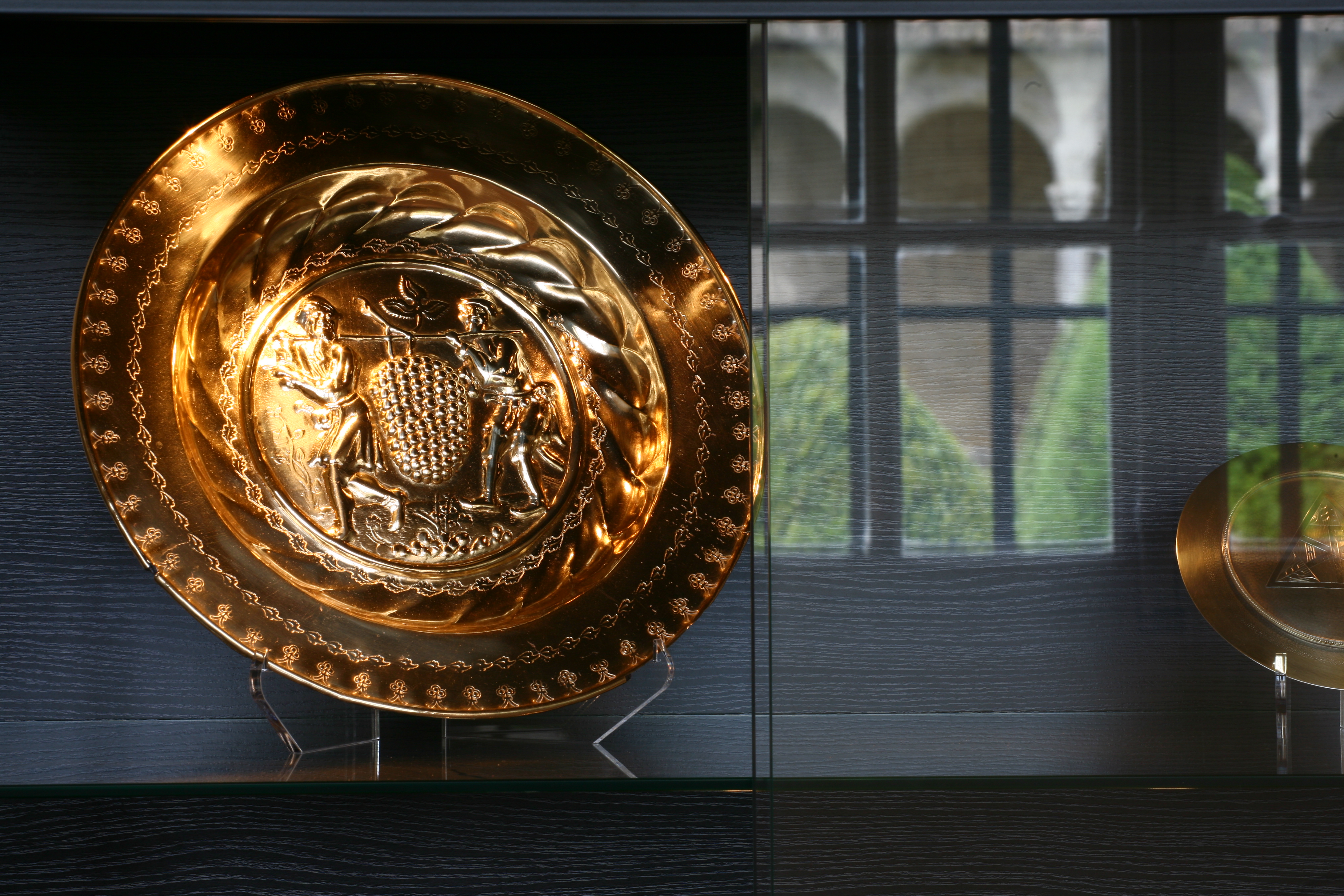 Ouverte sur le cloître par une grande paroi vitrée habillée de bois, la Galerie d’Art Sacré offre un écrin lumineux et apaisant à des trésors rarement exposés. Plus d’une vingtaine d’objets liturgiques y sont présentés, issus des églises : calices, ostensoirs-soleil, reliquaires, croix de procession…
