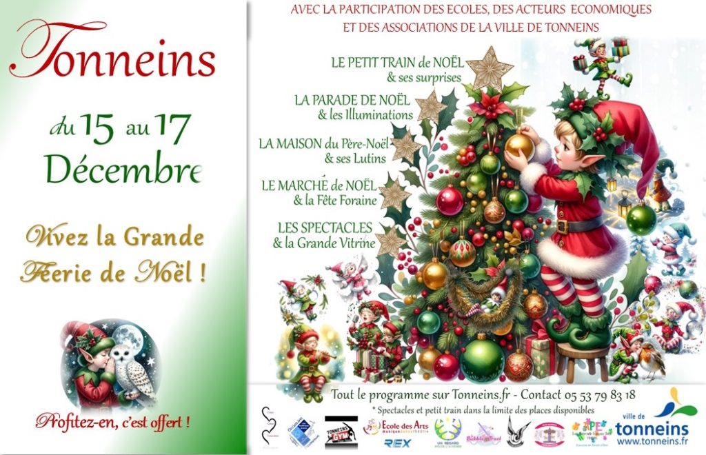 Vendredi 15 décembrePlace Jean Jaurès : Gagnez la Super Vitrine de Noël de l’AET du 2 au 20/12- remise des lots le 21/12 (le lieu et de l’horaire seront communiqués prochainement)17h30 Place Zoppola : Départ du Petit Train & Rue Foch Marché de Noël et Manèges : merveilles, crêpes, pomponnettes, chocolats, marrons & vins chauds… Spiritueux, foie gras, déco de Noël en bois et ardoise fait mains… Préparez vos fêtes !18h Rue St Jacques : Inauguration de la Maison du Père-Noël, le miroir magique.19h Place Zoppola : « La Grande Féerie de Noël ». Illuminations, Spectacles de Noël & parade Les Ambianceurs « La Brigade du Père-Noël ». Ensemble de percussions corporelles des élèves de l’Ecole des Arts et les Cheerleaders de Gym pour Tous.19h30 Rue Foch : Repas Garbure avec Les Ambianceurs « La Brigade du Père-Noël ».20h30 Eglise St Pierre : Concert de chant choral avec le chœur de « Tenaresa » de Condom (32) et le chœur des Diva’gations de Tonneins.