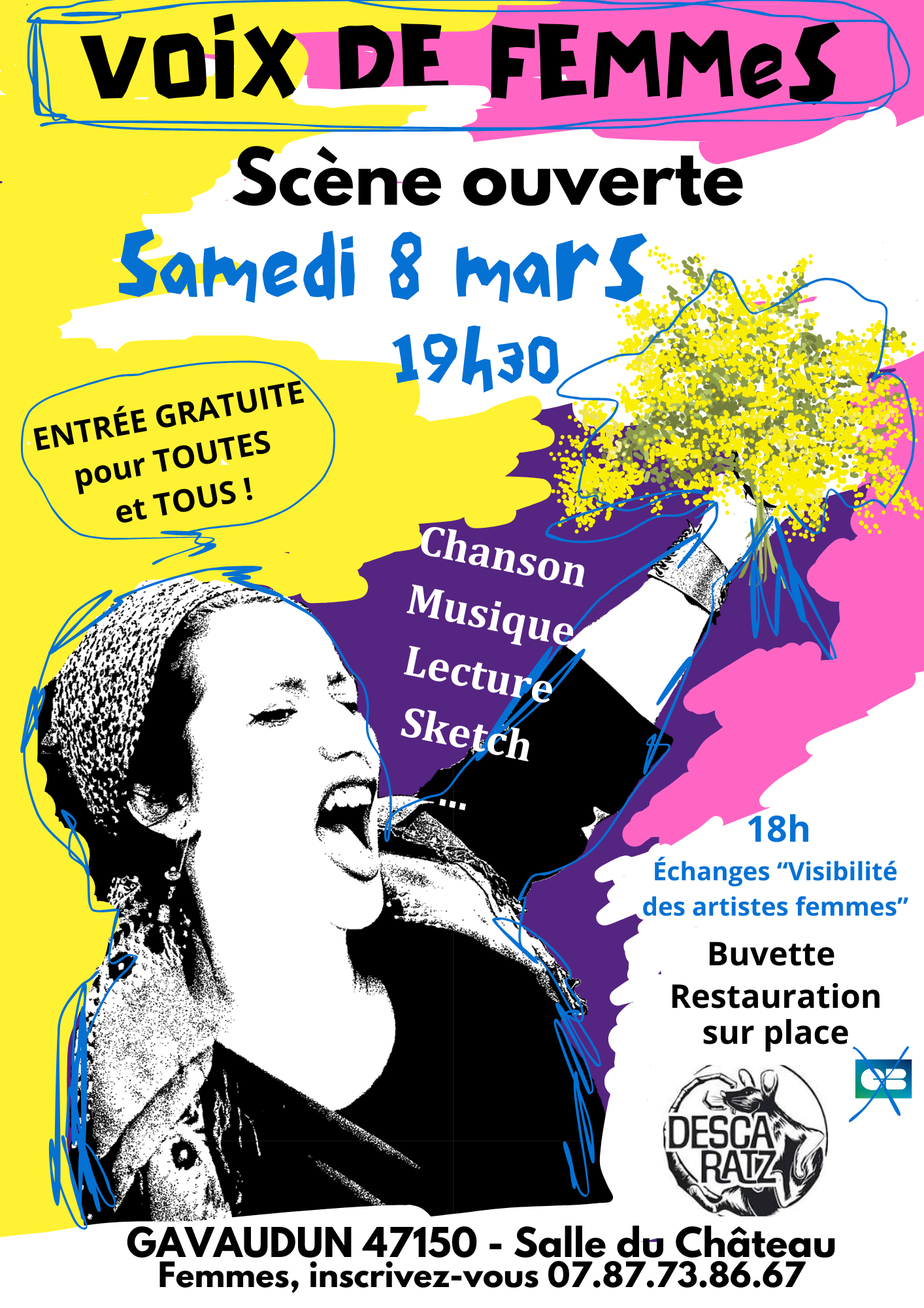 Rendez-vous SSamedi 8 Mars à la salle des fêtes de Gavaudun pour une soirée scène ouverte dédiée aux voix des femmes, à l’occasion de la Journée internationale des Droits des Femmes.