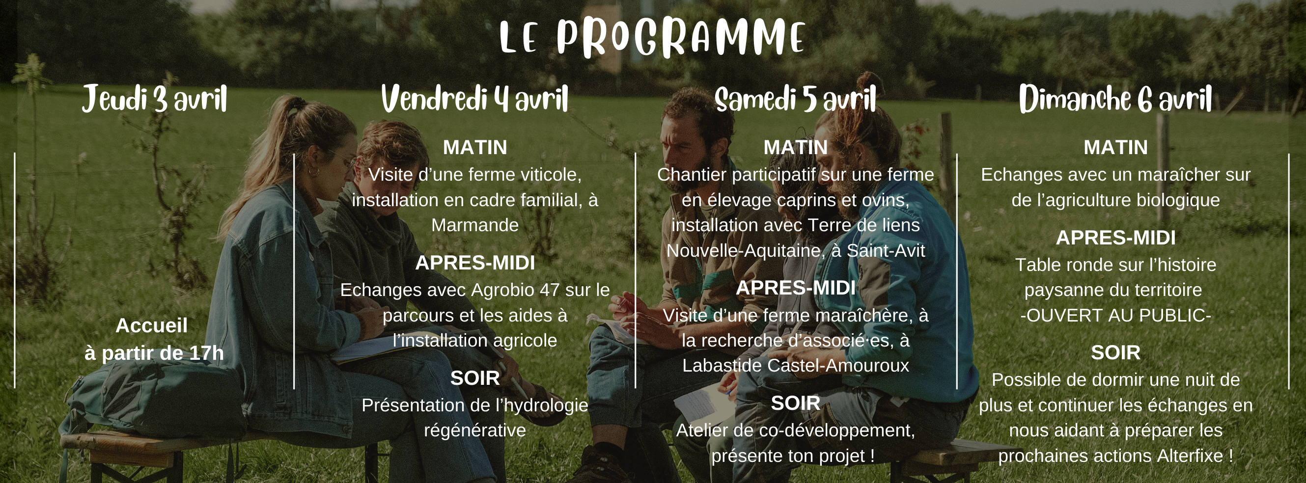 Pour notre tout premier week-end Alterfixe en Lot-et-Garonne nous avons concocté un programme pour partir à la rencontre de nouvelles et nouveaux installé⸱es (élevage, maraîchage, vigne…).