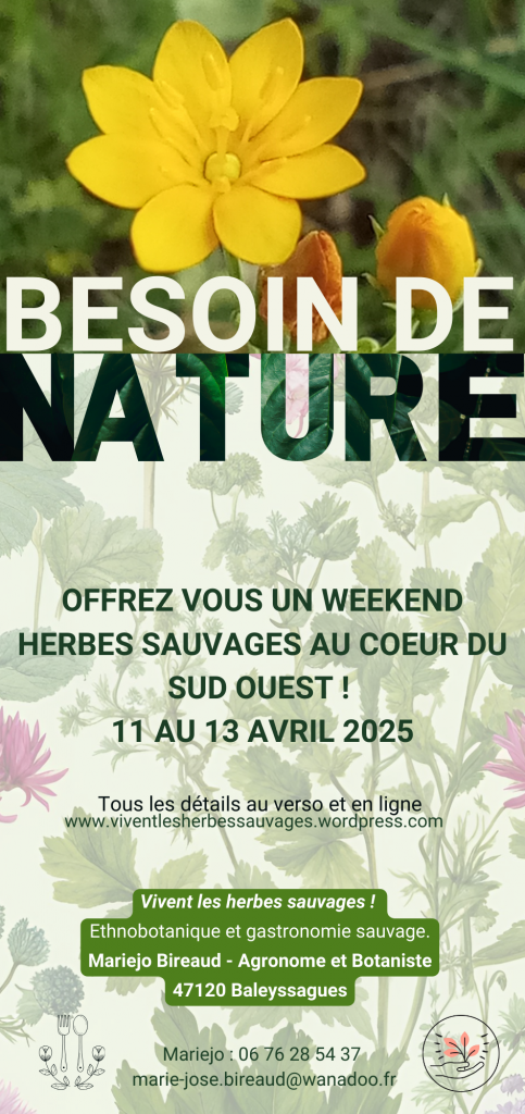 Vous serez au cœur de la biodiversité pour mieux connaitre les herbes sauvages, les reconnaitre, les cuisiner, les déguster. Vous pourrez aussi découvrir leurs bienfaits en soins quotidiens.