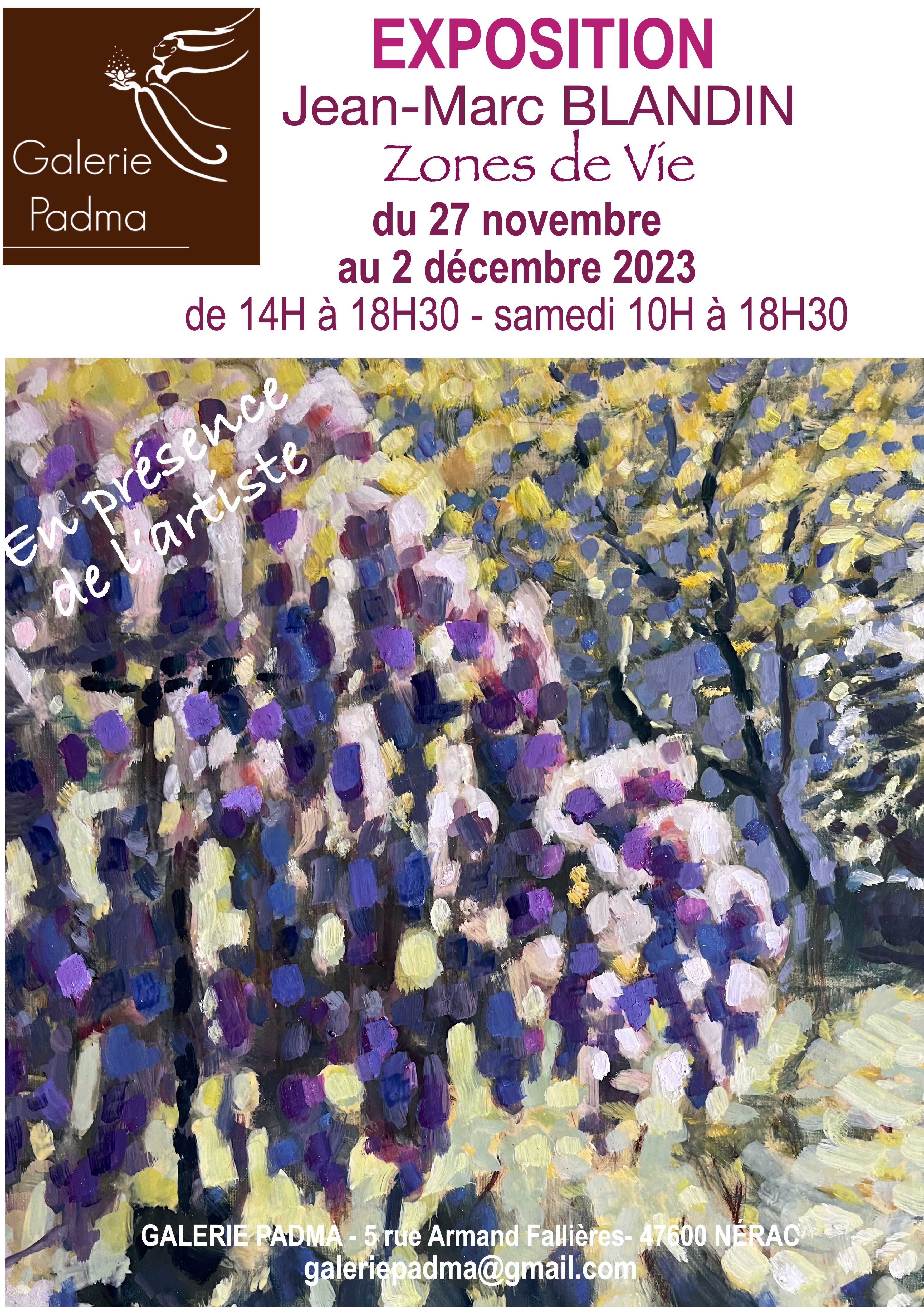 Expositions Zones de vie Exposition de peintures GALERIE PADMA - Nérac 5 Rue Armand Fallières Nérac Voir tous les événements se déroulant ici du 27 novembre au 2 décembre 2023 Gratuit Exposition de Jean-Marc Blandin. Galerie PADMA 06 87 82 13 75 galeriepadma@gmail.com